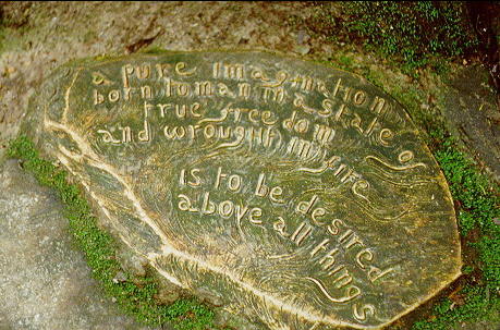The sculptures are carefully sited, some in cul-de-sacs with oval entrances. A frame to see through, a place to pass into, and often a plaque - a thought, a story, a manifesto from the artist.